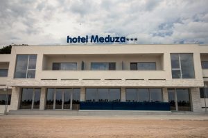 Acesta este Hotelul Meduza ce ofera cazare in statiunea Olimp, este situat pe zona limitrofa a plajei, distanta fiind de doar 4m.